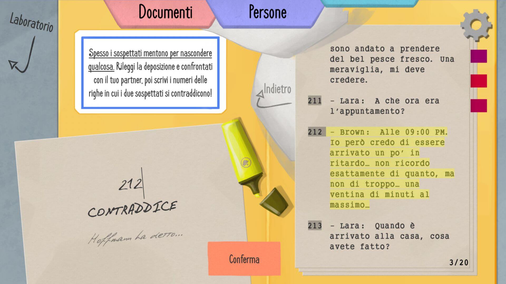 Un’altra meccanica di gioco poco funzionante è il confronto degli appunti: Mark e Lara (e quindi i due giocatori) devono trovare contraddizioni nelle dichiarazioni dei due sospettati. In pratica, devono controllare le deposizioni e indicare in quali linee uno dei due sospetti ha contradetto l’altro.