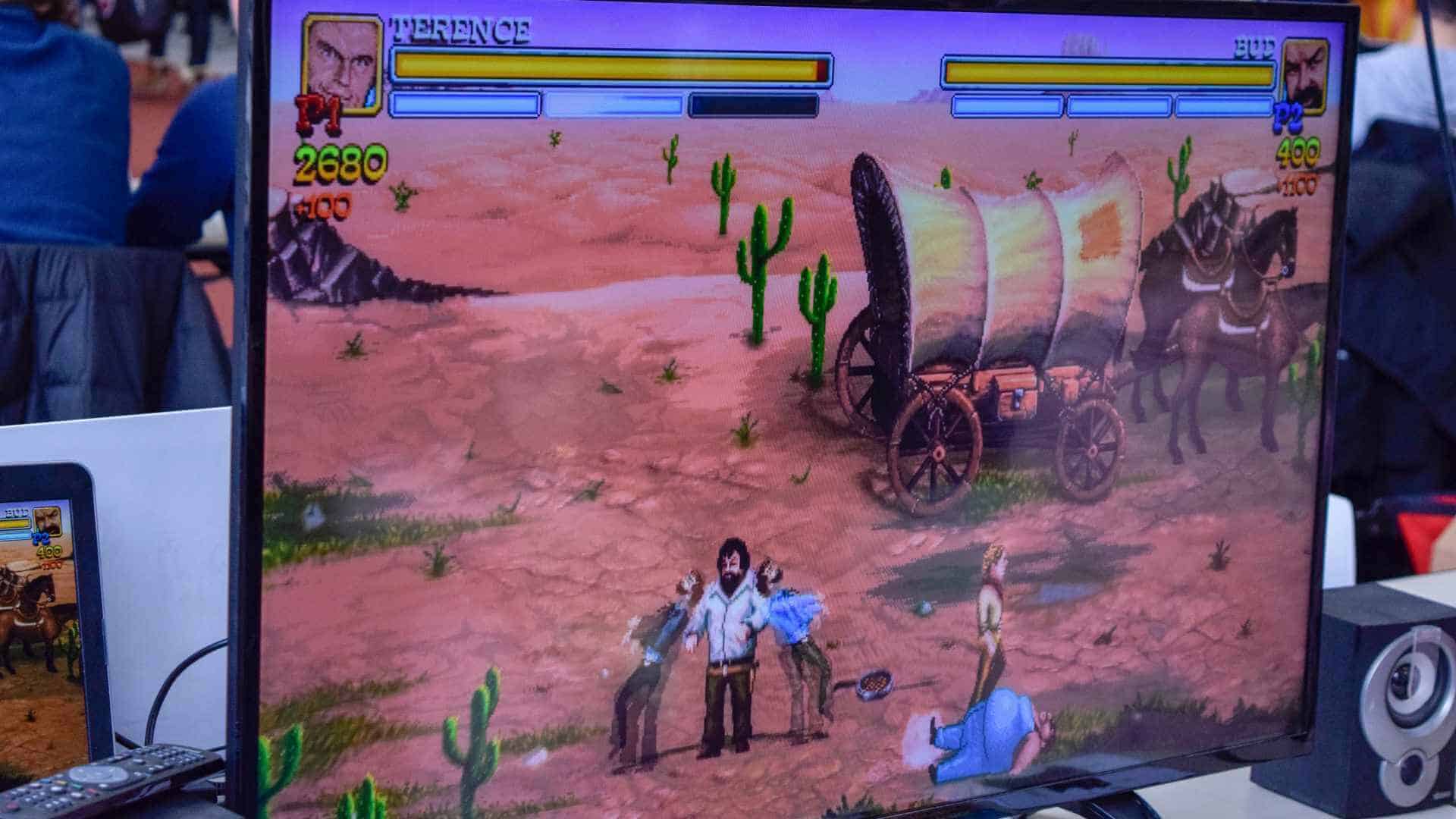 Non potevano mancare gli sviluppatori indipendenti italiani che hanno portato i loro progetti da mostrare al pubblico del Nerd Show. Tra i presenti, Trinity Team, gli sviluppatori di Bud Spencer & Terence Hill – Slaps And Beans, action 2D con grafica pixel art ispirato ai mitici film di Bud Spencer e Terence Hill. Provato in cooperativa su una postazione arcade, il titolo sembra ben realizzato e fedele ai due personaggi, con tanto di suoni e battute prese direttamente dai film. Gli sviluppatori mi hanno gentilmente consegnato una copia di cui scriverò un articolo a breve.
